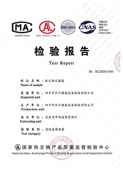 國家熱交換產品質量監督檢驗中心檢驗報告